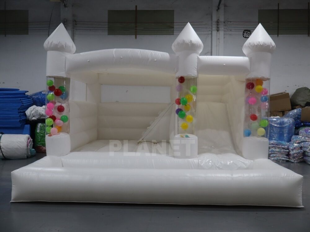 They are typically made of durable PVC Tarpaulin and feature inflatable walls and floors to provide a soft and bouncy surface for jumping and playing. In addition to being used for children's parties, white bounce houses can also be used for weddings, and other outdoor gatherings where guests of all ages can enjoy some fun and entertainment.